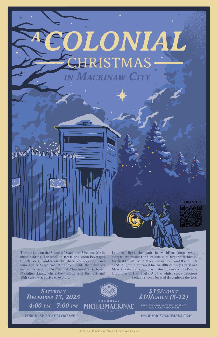Lanterns light the path in Michilimackinac where storytellers recount the various traditions of historic residents, a retelling of the first Christmas at Mackinac in 1679, and the church at Ste. Anne’s prepared for Christmas Mass as it would have been in the 18th century. Create crafts to take home and bring the family out on the Parade Ground for historic games. All the while, enjoy delicious holiday snacks located throughout the fort.