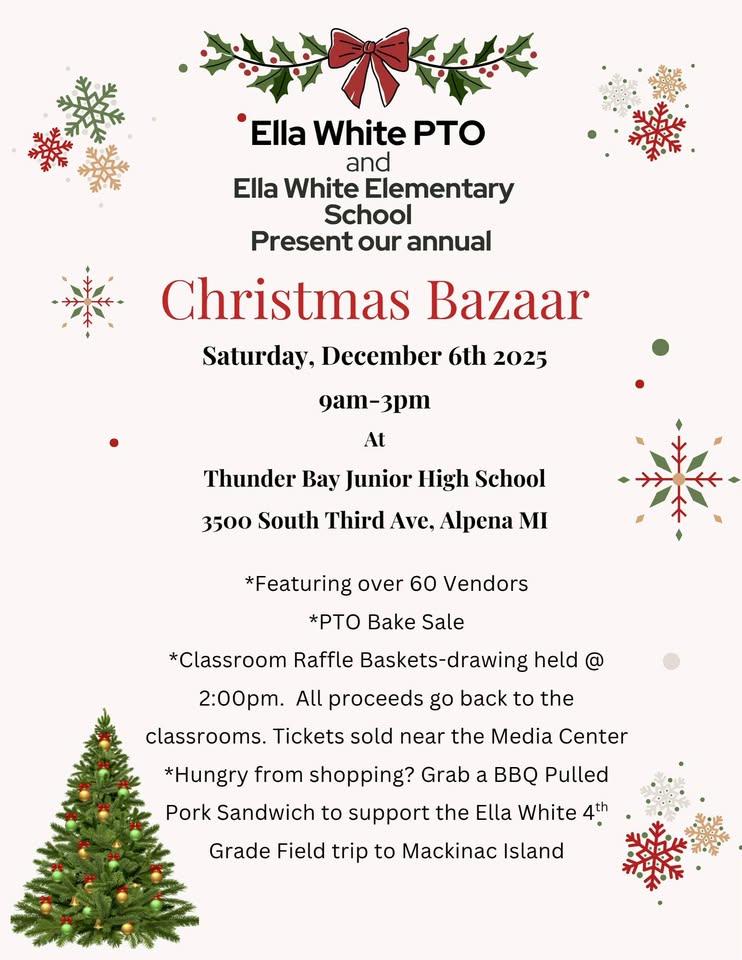 Come on out and support our amazing students, teachers and vendors at the annual Ella White PTO Christmas Bazaar. We have new and returning vendors with amazing crafts, teacher raffle baskets, bake sale and a pulled pork fundraiser for our 4th grade Mackinac Island trip. We can’t wait to see you on December 6th!